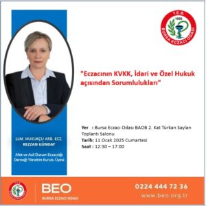 11 Ocak 2025 Cumartesi günü BAOB 2. kat Türkan Saylan Toplantı salonunda 12:30-17:00 saatleri arasında LLM, Hukukçu, ARB. Ecz. Rezzan Günday tarafından “Eczacının KVKK, İdari ve Özel Hukuk açısından Sorumlulukları” eğitimi verilecektir. Katılım için Odamızla iletişime geçmeniz önemle rica olunur.